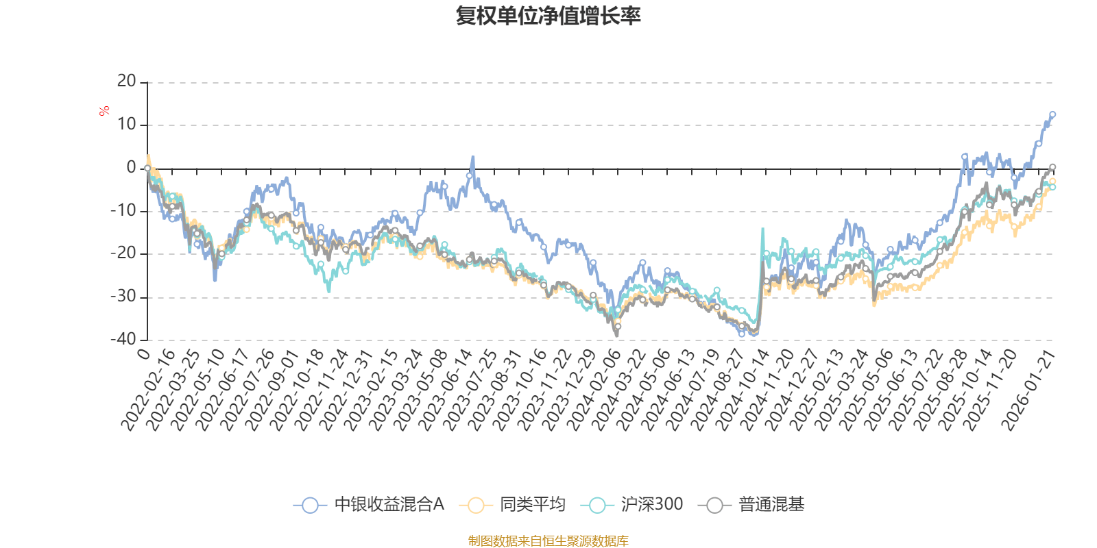 截至1月21日,中银收益混合A近三个月复权单位净值增长率为12.18%,位于同类可比基金39/134;近半年复权单位净值增长率为28.78%,位于同类可比基金40/134;近一年复权单位净值增长率为39.55%,位于同类可比基金36/131;近三年复权单位净值增长率为27.65%,位于同类可比基金39/124。